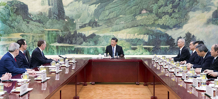 国家主席习近平15日在人民大会堂会见来华进行新一轮中美经贸高级别磋商的美国贸易代表莱特希泽和财政部长姆努钦。